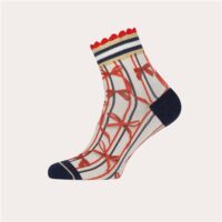 Les chaussettes XPOOOS Bow jouent la carte du détail qui fait tout : de délicats nœuds rouges imprimés sur un fond à fines rayures, une transparence légère ultra féminine et une finition festonnée rouge pour la petite touche couture.