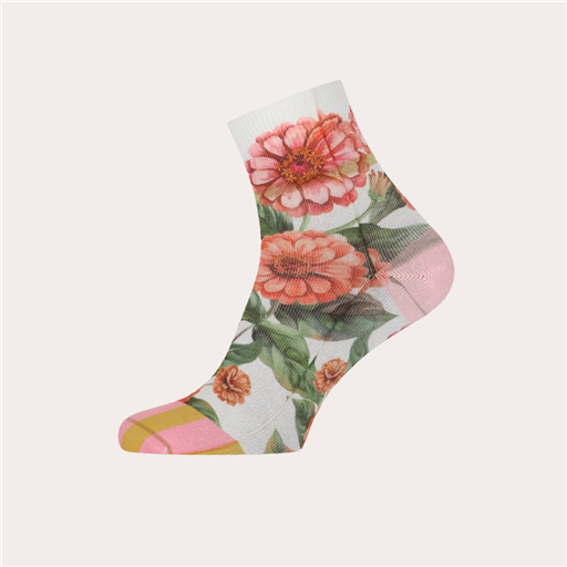 Les chaussettes XPOOOS Lana sentent bon le printemps avec leurs grandes fleurs éclatantes aux tons corail et rose, posées sur un fond clair lumineux. Le détail qui fait craquer ? La pointe rayée rose et jaune et la fine touche dorée scintillante qui apporte juste ce qu’il faut de lumière.