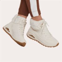 Alliez style urbain et confort d’hiver avec les baskets montantes Skechers.