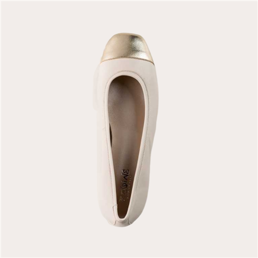 Confectionnées en cuir blanc cassé, elles se distinguent par leur renfort à la pointe en cuir lisse platine, détail graphique et sophistiqué qui capte la lumière sans en faire trop. Un contraste délicat qui structure la chaussure et apporte une note précieuse à l’ensemble.