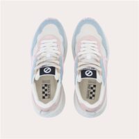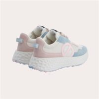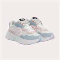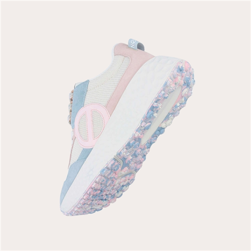 Son mix de polyester recyclé certifié GRS et de cuir de vachette velours joue sur les textures et les contrastes, tandis que les tons bleu ciel et rose pâle apportent une touche pastel ultra-fraîche.