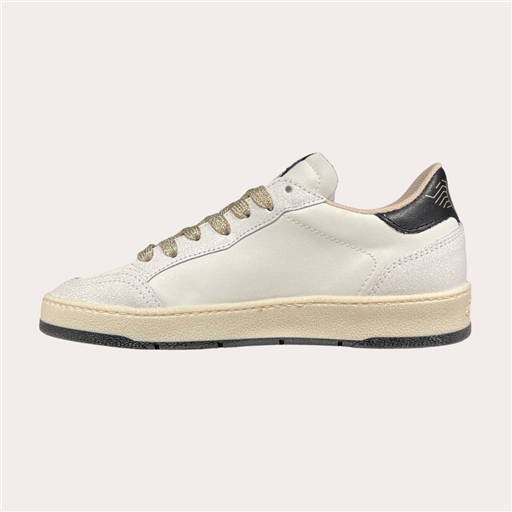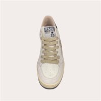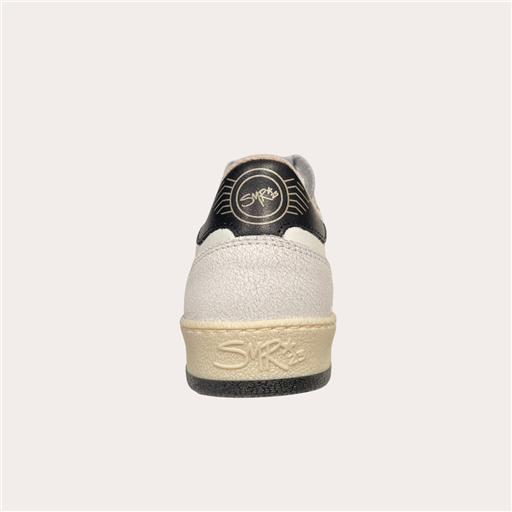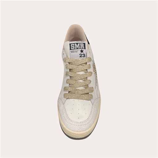 Son jeu de matières en cuir blanc, effet craquelé, et empiècements glitter doré apporte du relief et une vraie personnalité au modèle. L’iconique éclair SMR scintillant signe la paire avec caractère, tandis que les lacets dorés ajoutent une touche chic et lumineuse.