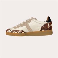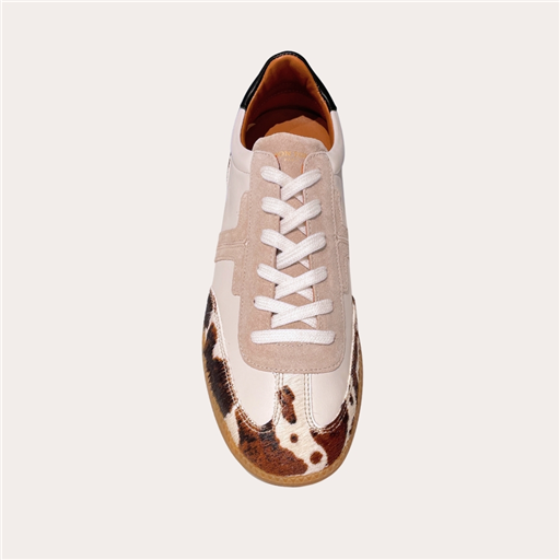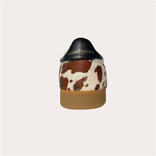 La base en cuir blanc apporte fraîcheur et élégance, tandis que les empiècements en cuir façon poulain aux nuances brunes créent ce contraste chic et audacieux qu’on adore. La pièce en suède beige sur le dessus ajoute de la douceur visuelle, et le contrefort noir signé Maison Toufet vient structurer l’ensemble avec caractère. La semelle gomme couleur miel renforce son esprit rétro et assure confort et adhérence au quotidien.