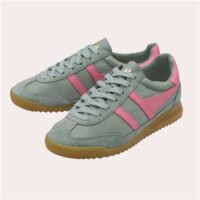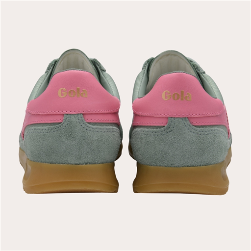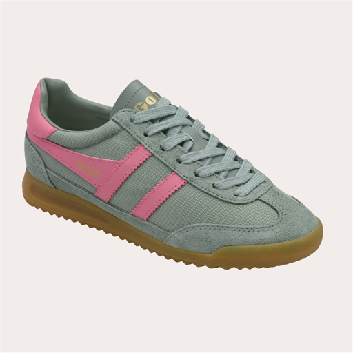 Avec leur nylon tissé vert à l’allure old school, leurs empiècements en suède assorti sur la pointe, le talon et le laçage, et surtout leur wingflash Gola rose fluo aux bords dentelés, les Tornado mixent esprit vintage et twist pop ultra assumé.