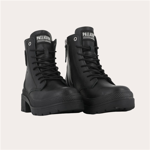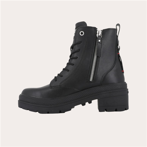 Affirme ton style avec les bottines Palladium Pallarise Ranger pour femme, une version moderne et féminine des emblématiques rangers de la marque. Conçues en cuir noir de qualité, elles associent robustesse et élégance urbaine. Leur semelle crantée épaisse assure une adhérence optimale et un confort de marche au quotidien, tandis que le talon bloc apporte une touche féminine et affirmée.
