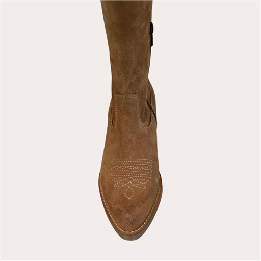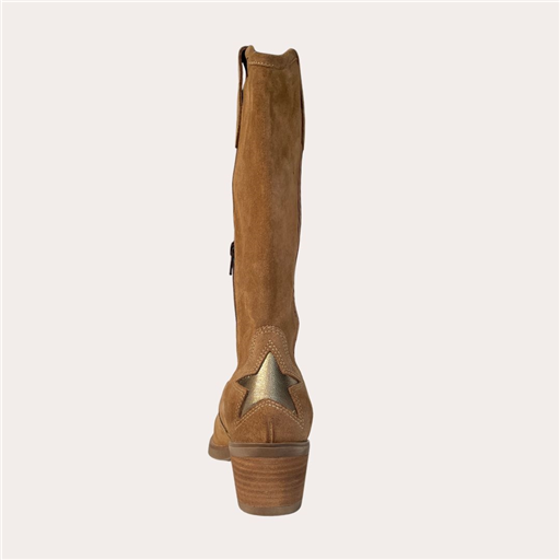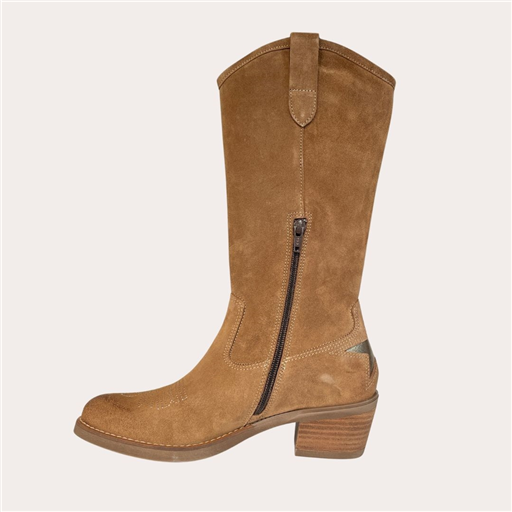 Adoptez un style western chic avec les bottes MKD Apolon en daim. Inspirées de l’univers cowboy, elles affichent une tige mi-haute au design authentique, sublimée par des surpiqûres décoratives et un empiècement étoile doré à l’arrière pour une touche tendance. La fermeture latérale zippée garantit un enfilage pratique, tandis que le talon bottier de hauteur confortable allonge la silhouette sans compromettre le confort. Conçues en cuir suédé de qualité, ces bottes se marient aussi bien avec un jean slim qu’avec une robe fluide pour un look affirmé et féminin.