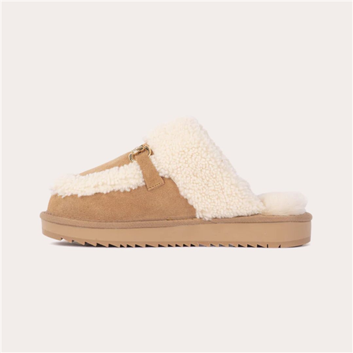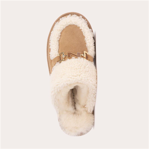 Adoptez le confort absolu avec les mules fourrées Nathan Baume. Confectionnées en daim camel, elles sont doublées de fourrure synthétique douce pour un effet cocooning irrésistible. Leur semelle épaisse en gomme assure une excellente adhérence, tandis que l’ornement métallique siglé « N » sur le dessus apporte une touche élégante et moderne. Faciles à enfiler, ces mules allient chaleur, confort et style pour vos moments de détente à la maison ou vos sorties décontractées.