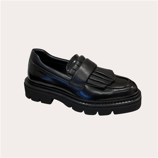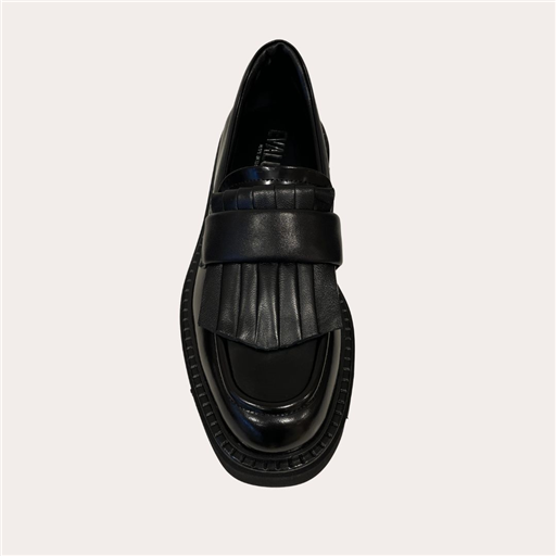 Les mocassins Eva Luna réinventent le style classique avec une touche moderne et audacieuse. Conçus en cuir verni noir de haute qualité, ils se distinguent par leur empeigne ornée d’un élégant plastron à franges et d’un large strap, offrant un look sophistiqué et tendance. Leur semelle épaisse crantée en gomme noire garantit un confort optimal et une allure affirmée, idéale pour dynamiser vos tenues du quotidien ou apporter du caractère à vos looks habillés. Ces mocassins sont un choix parfait pour les femmes recherchant un équilibre entre élégance, originalité et praticité.