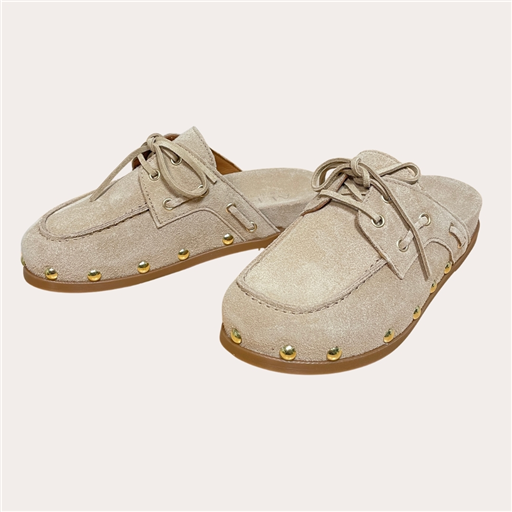 En cuir velours tout doux, il joue la carte du naturel chic avec sa teinte sable ultra facile à associer. On adore sa forme mocassin revisitée en version mule ouverte à l’arrière (pratique, on glisse le pied et c’est parti). Les petits clous dorés le long de la semelle apportent la touche lumineuse qui fait toute la personnalité du modèle.