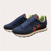 Apportez une touche de style sportif et contemporain à vos looks avec les baskets homme Sun 68. Conçues dans un mélange de textile et suède bleu marine, elles sont mises en valeur par le logo ΔX orange vif sur le côté, signature emblématique de la marque.